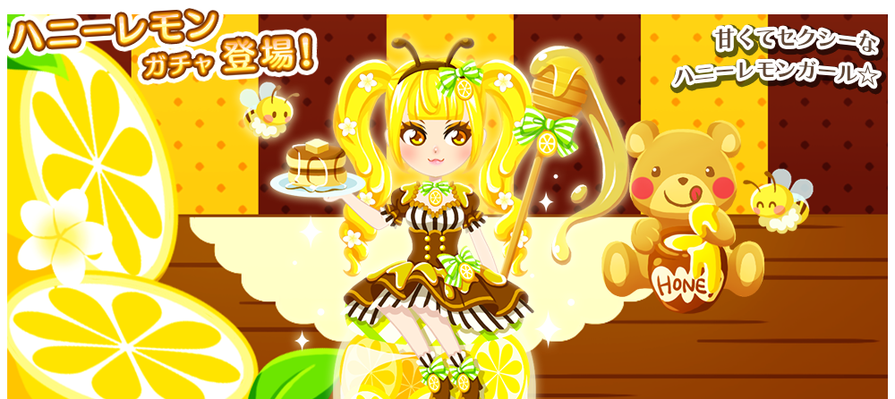 ハニーレモンガチャ 初回リリース日:2016/1/20 甘くてセクシーなハニーレモンガール☆ SSR ハニーレモン 背景 女性 SSR はちみつ欲しいな オブジェクト 女性 SR ハニーレモンガール トップス 女性 SR ハニーレモンな髪 髪型 女性 R ハニーチョーカー ネックレス 女性 R ハニーパンケーキ 右手アイテム 女性 R ハニーディッパー 左手アイテム 女性 R ハニーカチューシャ 髪飾り 女性 R ハニーレモンな目 目 女性 ※本ガチャは女性用のみとなります。