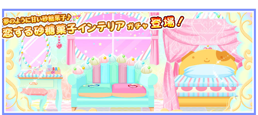 恋する砂糖菓子インテリアガチャ 初回リリース日:2017/1/17 夢のように甘い砂糖菓子♪ SSR 砂糖菓子のシャンデリア 3 マス 天井 SSR 砂糖菓子の窓 3 マス 壁掛け SR 砂糖菓子のフレーム 8 マス フレーム SR 砂糖菓子の壁紙 8 マス 壁紙 R 砂糖菓子の時計 1 マス 壁掛け R 砂糖菓子のドレッサー 2 マス 床置き R 砂糖菓子のソファ 3 マス 床置き R 砂糖菓子のベッド 3 マス 床置き R 砂糖菓子のフロア 8 マス 床