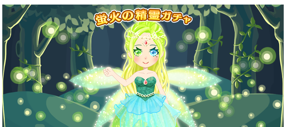 蛍火の精霊ガチャ 初回リリース日:2016/5/23 神秘的な森で出会う蛍火の精霊 SSR 幻蛍火の森 背景 共通 SSR 幻蛍火の舞 オブジェクト 共通 SR 幻蛍火ドレス トップス 女性 SR 蛍火グラデーション 髪型 女性 R 蛍火羽 背中アイテム 女性 R 蛍火ガール トップス 女性 R 蛍火ヘッドドレス 髪飾り 女性 R 蛍火オッドアイ 目 女性 R 蛍火ヒール 靴 女性 ※本ガチャは女性用のみとなります。